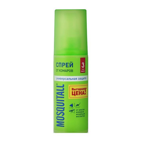 Спрей Mosquitall "Универсальная защита" предназначен для нанесения на открытые участки тела и одежду. Он эффективно защищает от укусов комаров, мокрецов, москитов. Благодаря удобному распылителю, спрей быстро и легко наносится и отпугивает комаров и других кровососущих насекомых. Не оставляет жирных следов на одежде. Время действия - до 3 часов. Средство подходит для всей семьи, разрешено к применению детям от 5 лет.